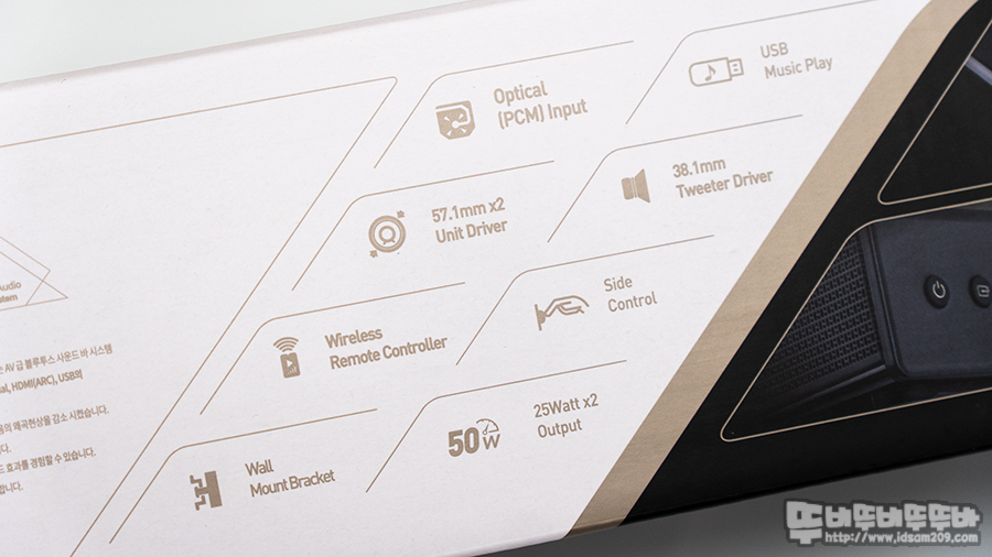 최신 트렌드가 되어버린 대형 LCD TV에 사용 가능한 90cm 사이즈와 2 Way 스피커 구성으로 50W 출력을 지원하는 사운드바로 HDMI ARC / 코엑시얼 / 광 입력 / AUX / USB 메모리 지원 등의 다양한 입력 소스를 지원으로 심심한 TV 출력을 홈시어터에 버금가는 사운드를 들려주는 활용도가 좋은 제품인데요.