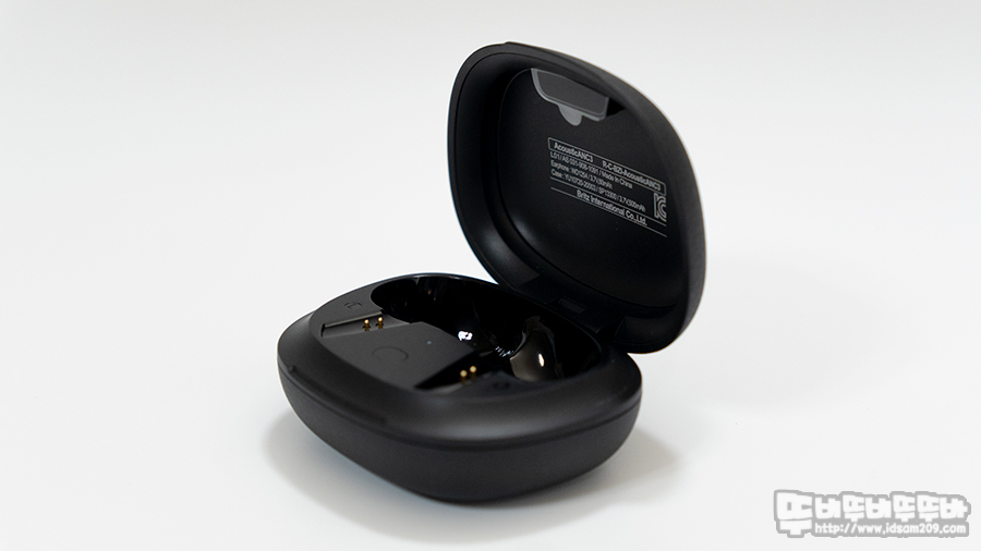 충전 케이스는 이어버드 버드 외형 그대로 안착하는 크레들 디자인으로 충전 케이스에 이어버드가 결합 시 충전 핀을 통해 자동으로 이어버드가 충전되는 구조로 되어있으며 충전케이스에는 L, R 표기와 중앙 부분에 페어링이 상태를 알려주는 LED 인디케이터와 페어링 버튼이 있습니다.