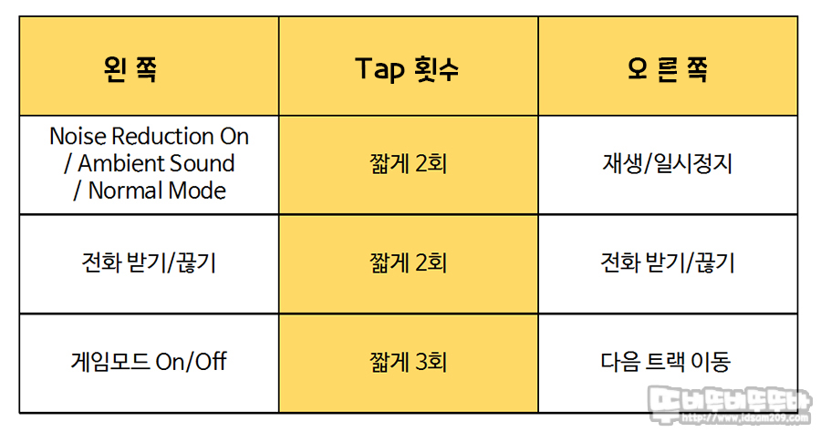 왼쪽 또는 오른쪽 이어버드 스틱 부분을 톡톡 건드려 제어하는 탭 컨트롤은 왼쪽과 오른쪽이 다른 기능으로 구성되어있는데요.