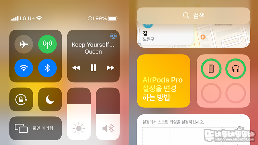필자가 사용하는 아이폰 11 Pro에서는 손으로 쓸어내려서 확인할 수 있는 제스처 메뉴에서 다양한 방법으로 AcousticANC3의 배터리 잔량 확인이 가능합니다.