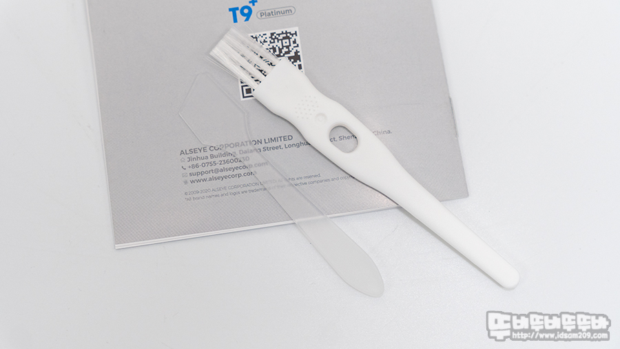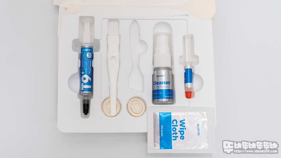 제품의 구성으로는 주사기에 담긴 ALSEYE T9+ Platinum 5g, 청소용? 정리용? 브러시와 서멀 도포용 스크래퍼, 일회용 알코올 페이퍼와, 스프레이 형 알코올, 쿨러 윤활유, 그리고 작업 시 손에 묻는 걸 방지하는 손가락 고무장갑으로 구성되어있습니다.