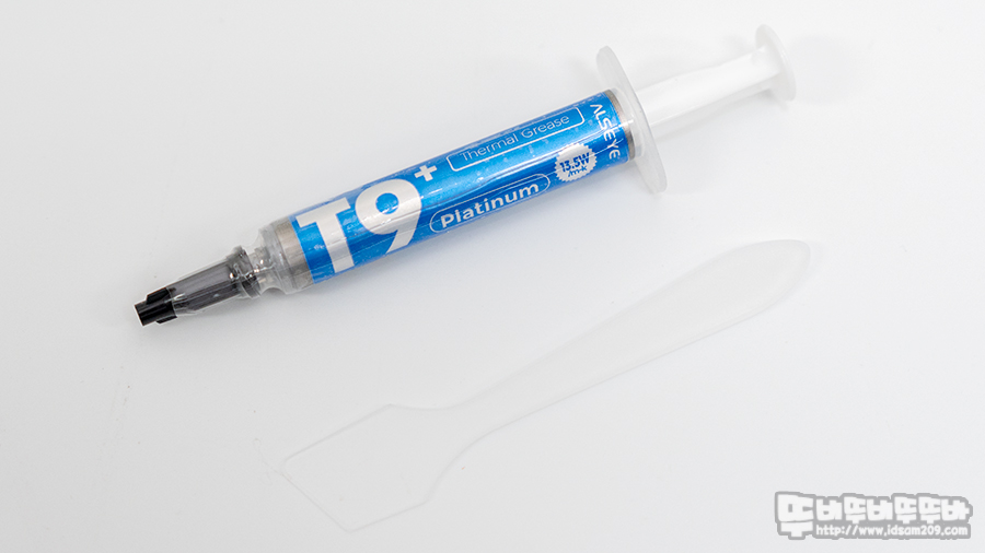 ALSEYE T9+ Platinum 2g은 주사기에 담긴 서멀 컴파운드와 CPU에 도포 시 얇게 바를 수 있는 스크래퍼가 동봉되어있습니다.