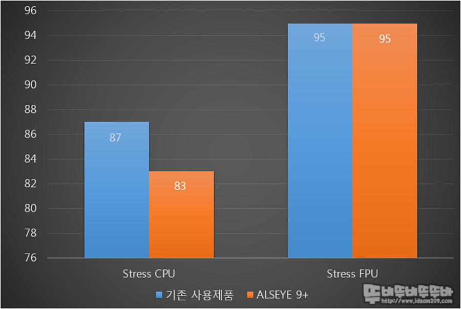 결과적으로 비슷해 보이지만 95도에 다다르는 시간이 ALSEYE T9+ Platinum보다 기존에 사용하고 있었던 4.5W/m-k 열전도율을 가진 서멀 컴파운드가 미약하지만, 천천히 올라가는 것을 확인할 수 있었습니다.