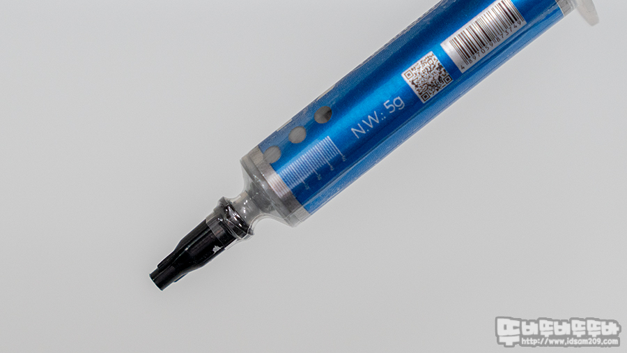 ALSEYE T9+ Platinum 5g 주사기 측면에는 5g 정량의 서멀 컴파운드가 담겨 있는 모습을 확인할 수 있습니다.