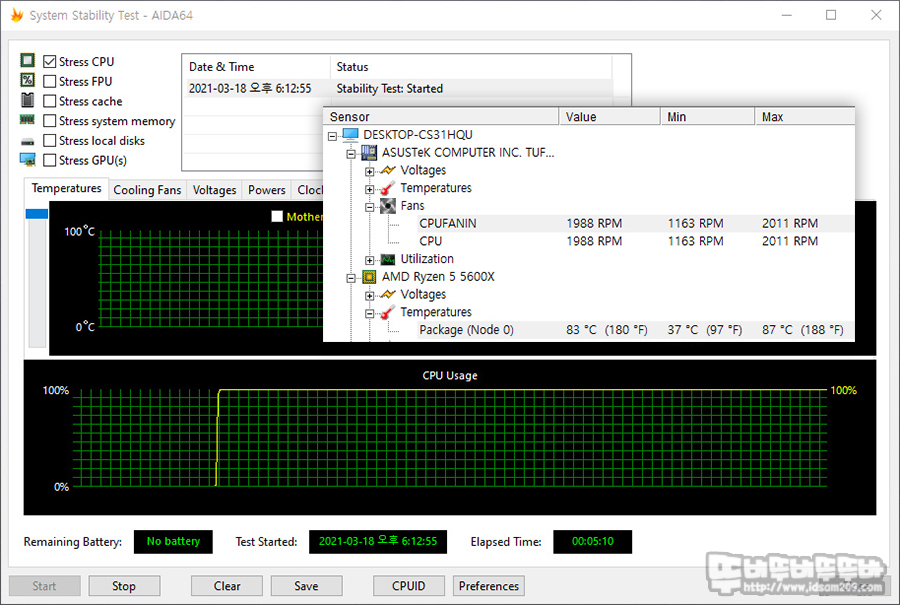 AMD 5600X CPU의 기본 쿨러 성능이 좋지 않기에 Stress CPU 테스트에서 -4도의 낮은 성능을 보여주고 있어 성능 좋은 타워형 쿨러를 사용하게 된다면 온도에 대한 확연한 차이를 기대할 수 있을 듯합니다.