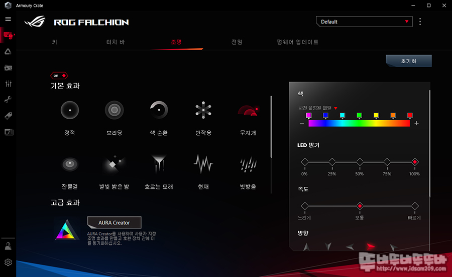 조명 메뉴에서는 AURA Sync와는 다른 ROG FALCHION 전용 LED 효과를 선택이 가능데 이 효과는 Fn + ←/→ 키를 이용한 LED 모드 변경과 동일한 기능이 참고하시기 바랍니다.