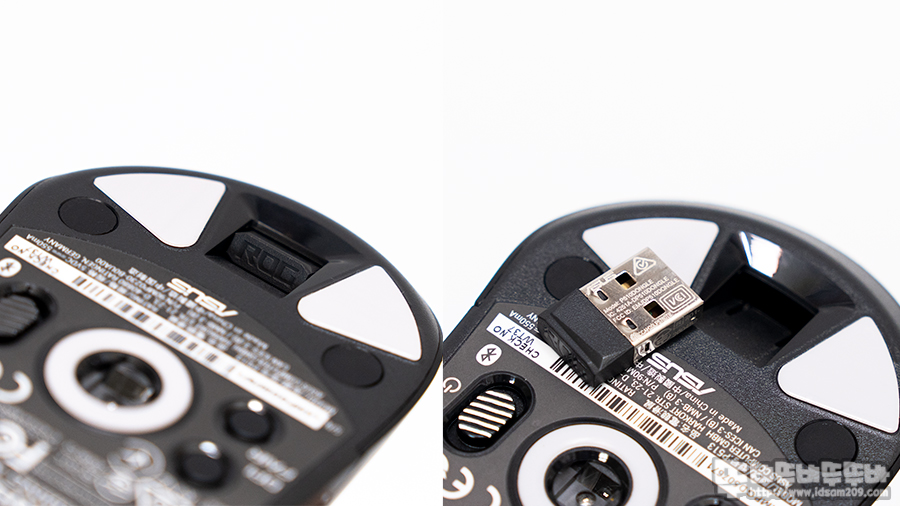 제품의 구성은 마우스 본체, 여분의 마우스 피트, 교체용 스위치(옴론 재팬), 교체용 사이드 버튼 (2종류), 충전 겸 유선 사용이 가능한 USB-C to USB-A 케이블, ROG 스티커와 사용 설명서로 구성되어있습니다.