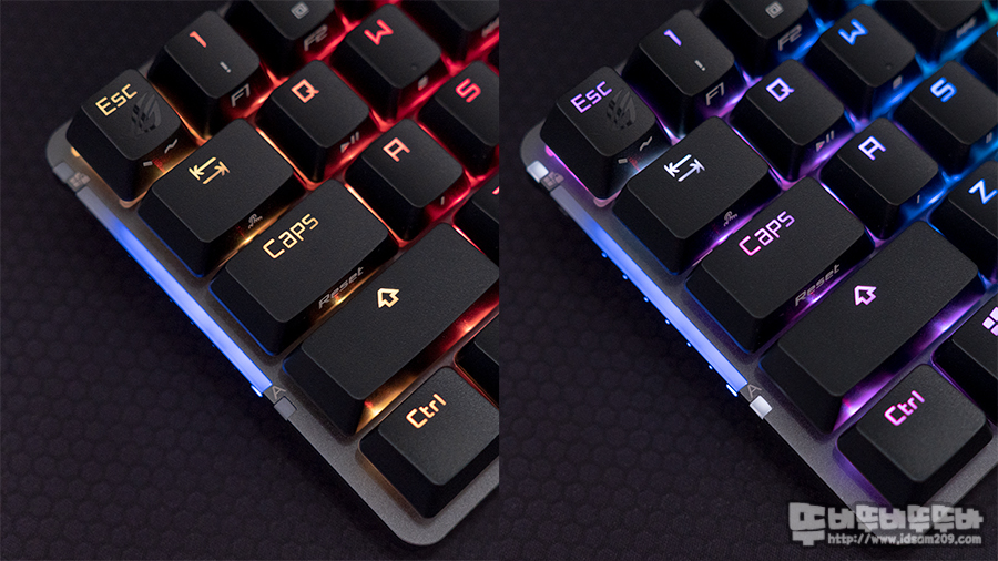 비키 타입의 키보드 상판에는 역방향으로 배치된 마제 방식의 스테빌라이저가 사용되었는데 체리 MX 스위치 경사 부분에 돌출된 스테빌라이저가 있어 스위치 및 키캡에 간섭을 일으키지 않으며 LED 빛 투과되는 PBT 이중사출 키캡을 사용한 게 특징입니다.