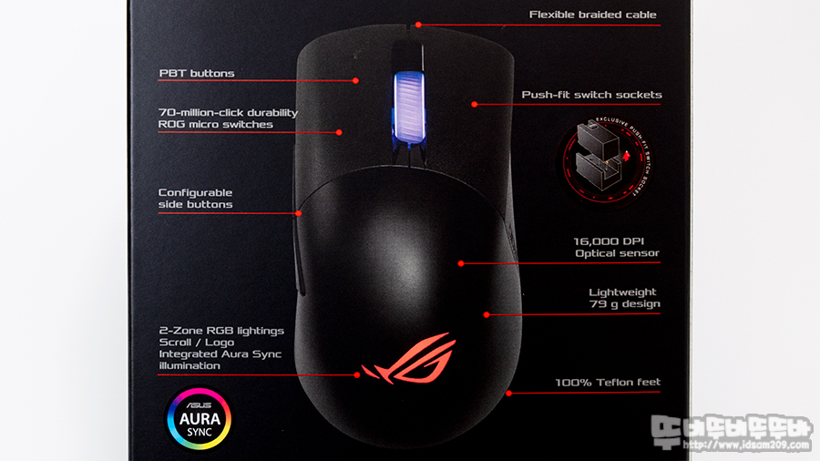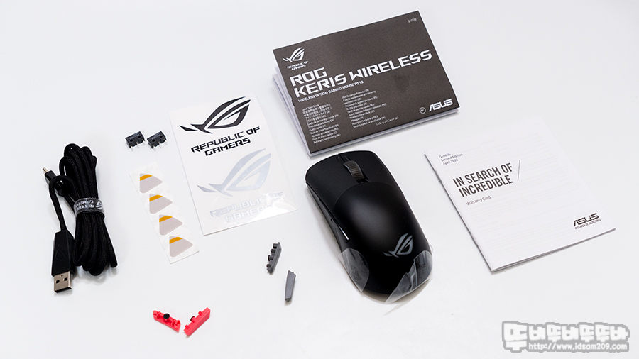 제품의 구성은 마우스 본체, 여분의 마우스 피트, 교체용 스위치(옴론 재팬), 교체용 사이드 버튼 (2종류), 충전 겸 유선 사용이 가능한 USB-C to USB-A 케이블, ROG 스티커와 사용 설명서로 구성되어있습니다.