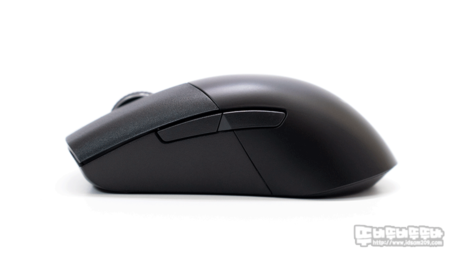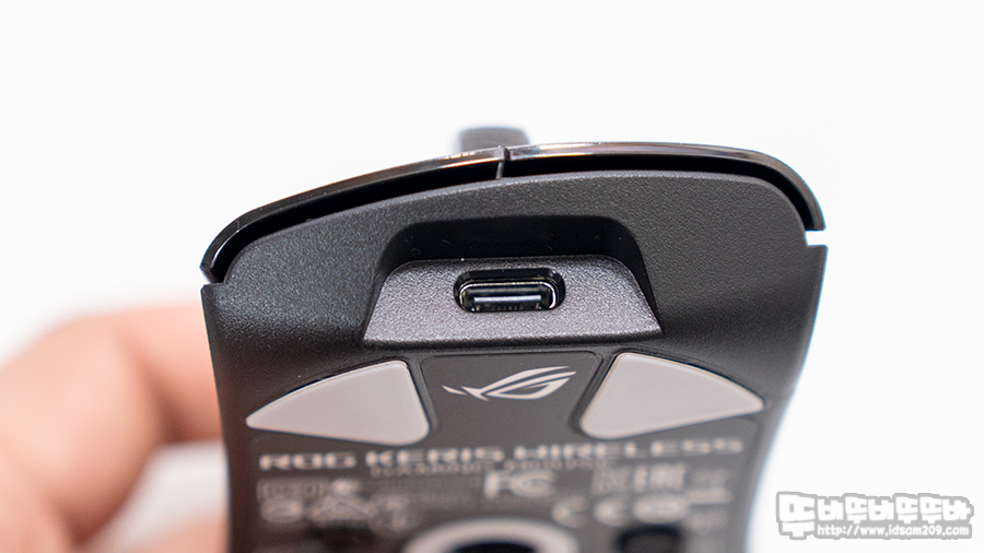 ROG Keris Wireless 마우스는 절개형 버튼 디자인에 PBT 재질을 사용하고 있어 버튼 사용 시 PBT의 뽀송뽀송한 느낌을 느낄 수 있으며 마우스 휠 스크롤과 뒷면에 로고 부분에 LED 효과를 표현하고 있습니다.
