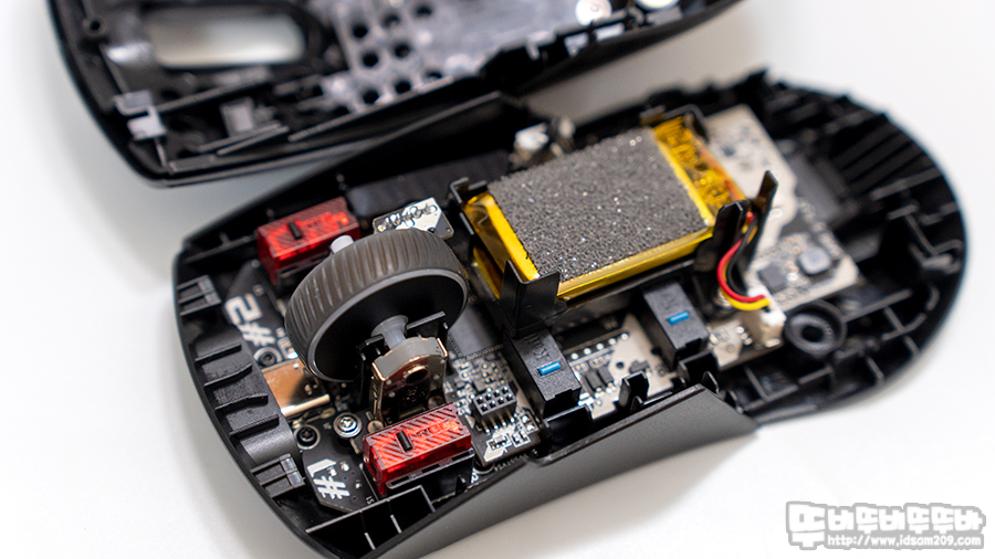 마우스 시 안정된 무게 벨런스를 느낄 수 있게 중앙부에 배치된 배터리 모습.
