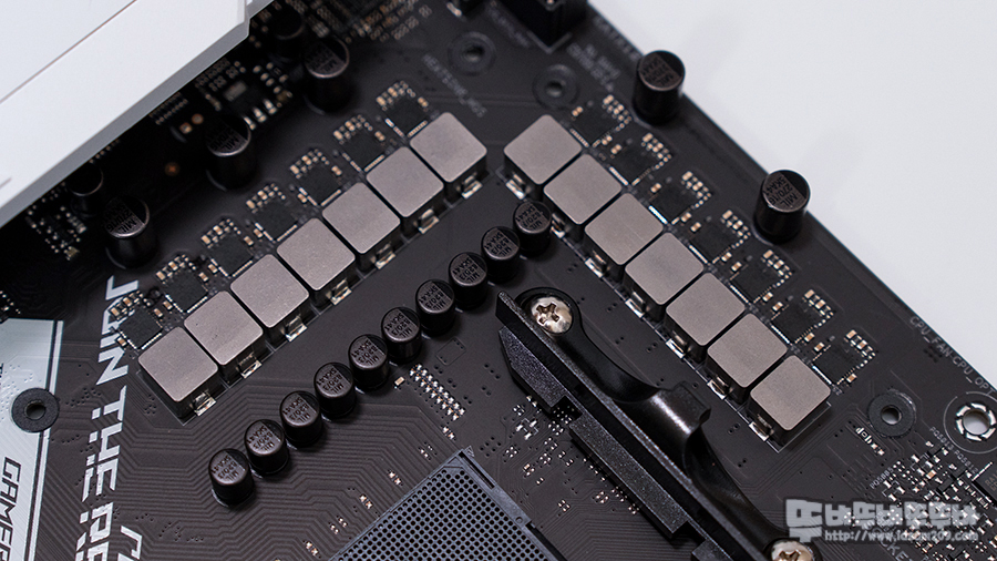 CPU 소켓 주변의 방열판을 제거한 12+2 페이즈의 전원부 모습.