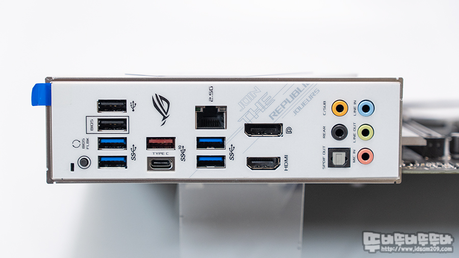 I/O 포트 구성을 살펴보면 USB 2.0 포트 2개 / USB 3.2 Gen 2 포트 2개 (USB-A, USB-C) / USB 3.2 Gen 1 포트 4개(블루컬러) / DP 1.2 포트 / HDMI 2.1(4K@60Hz) 포트 / 광출력 / 오디오 단자 그리고 intel I225-V 2.5Gb 이더넷으로 구성되어 있습니다.