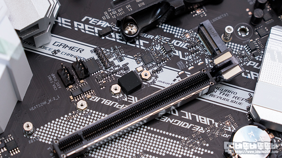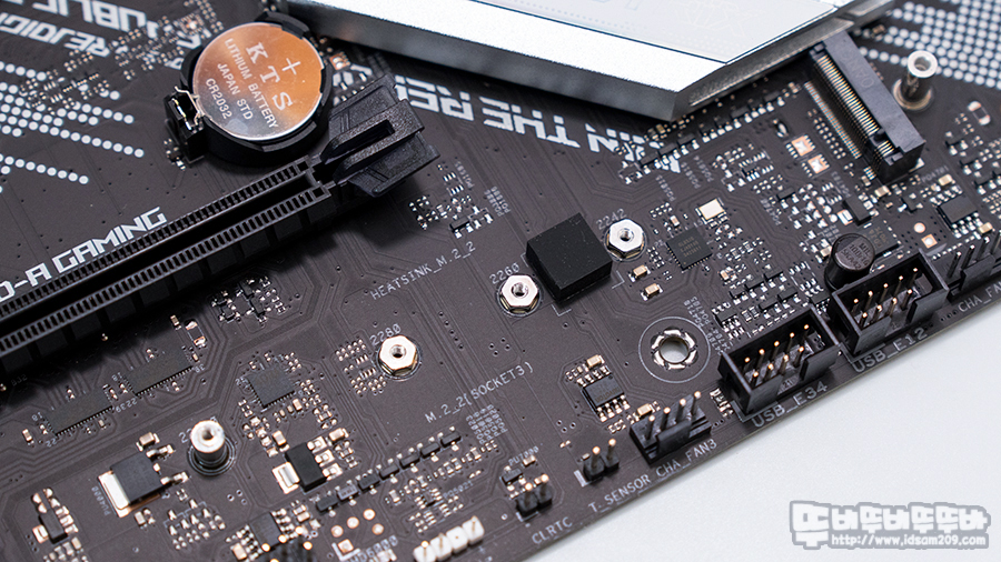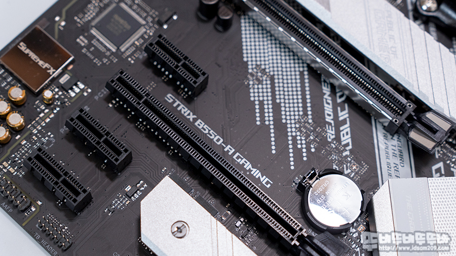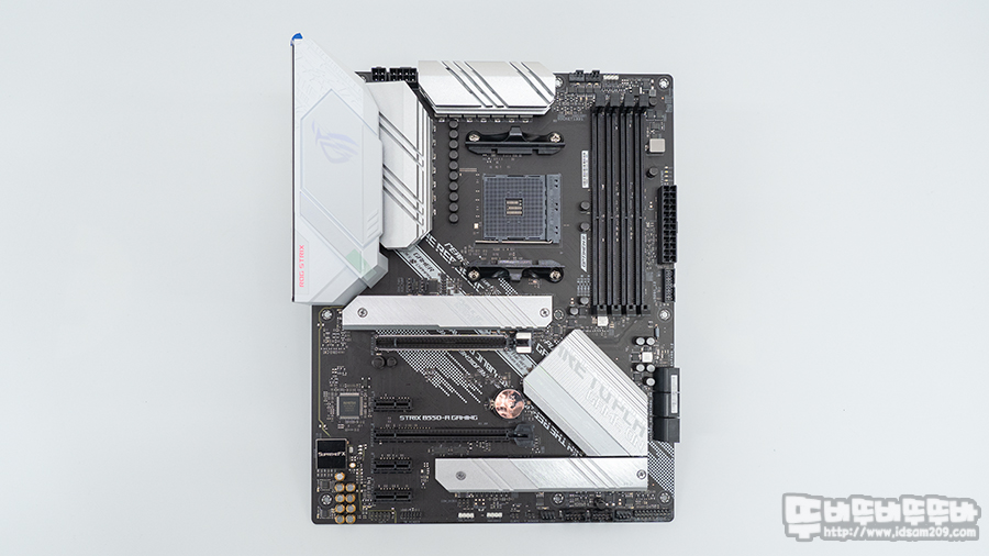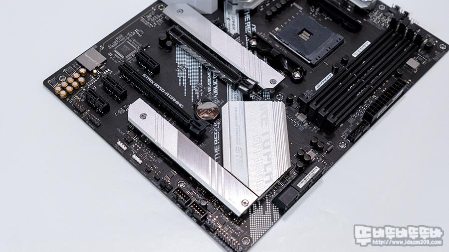 ASUS SASUS ROG STRIX B550-A GAMING 메인보드의 사우스 브릿지 인 B550 칩셋과 M.2 슬롯 부분에 고급스럽게 디자인된 히트싱크가 부착되어있는 게 특징인데요.