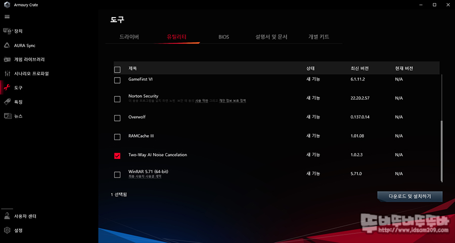 일전에 AI Noise-Canceling Microphone 기능을 지원하는 기사를 보았을 때 어디서 확인하나 했는데 Amoury Crate - 도구 - 유틸리티 메뉴에서 다운로드가 가능하네요.