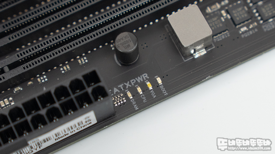 메인보드 커넥터 옆에 위치한 시스템 부팅 시 CPU/메모리/그래픽카드 진단과 부팅 장치의 문제를 빠르게 알려주는 LED 인디케이터입니다.