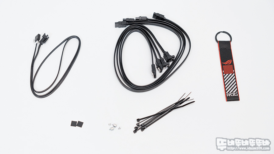 Addressable LED 확장 케이블, SATA 6Gb/s 케이블 4개, M.2 고무 패키지, M.2 SSD 너트/나사, 케이블 타이, 스트랩 열쇠고리 모습.