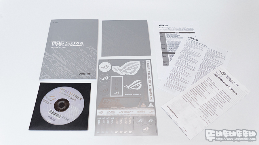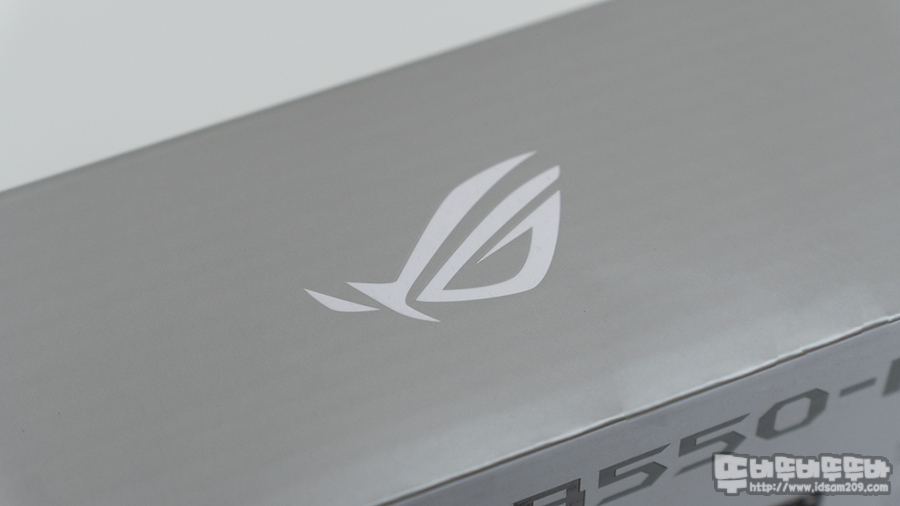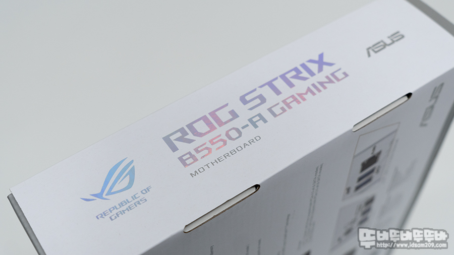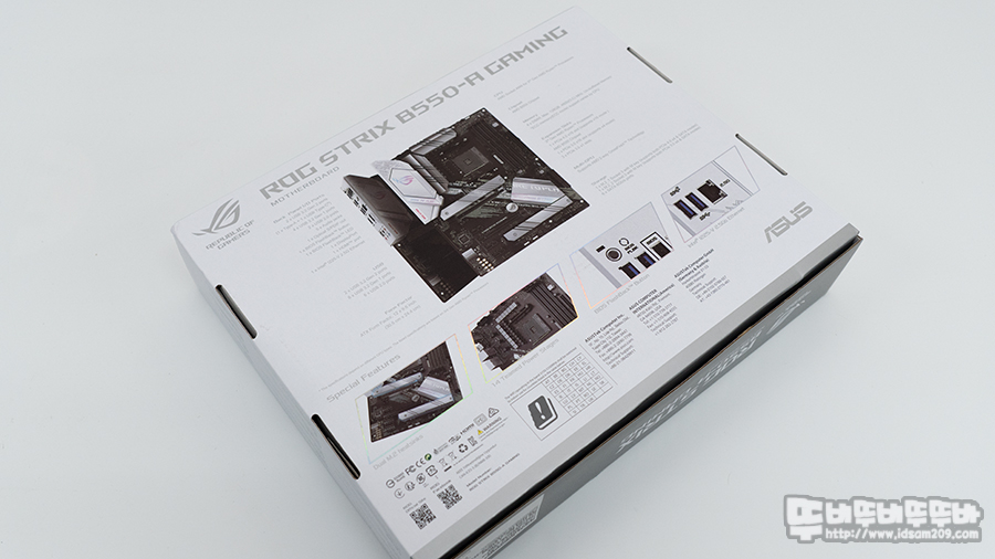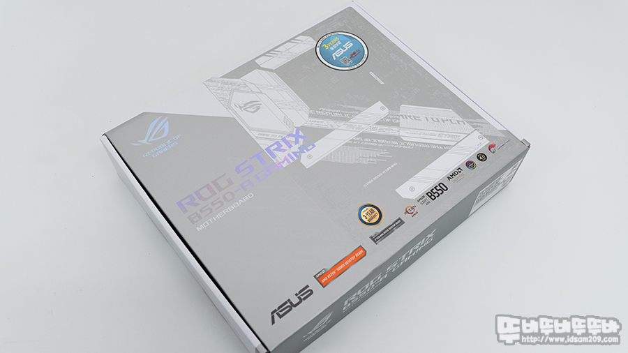 ASUS ROG STRIX B550-A GAMING 패키지는 인쇄 용어로 박찍기를 사용한 블링블링한 로고와 제품명에 빛에 따라 반짝이는 홀로그램 효과를 표현하며 화이트/그레이톤으로 제작되어 고급스러움을 주고 있는데요.