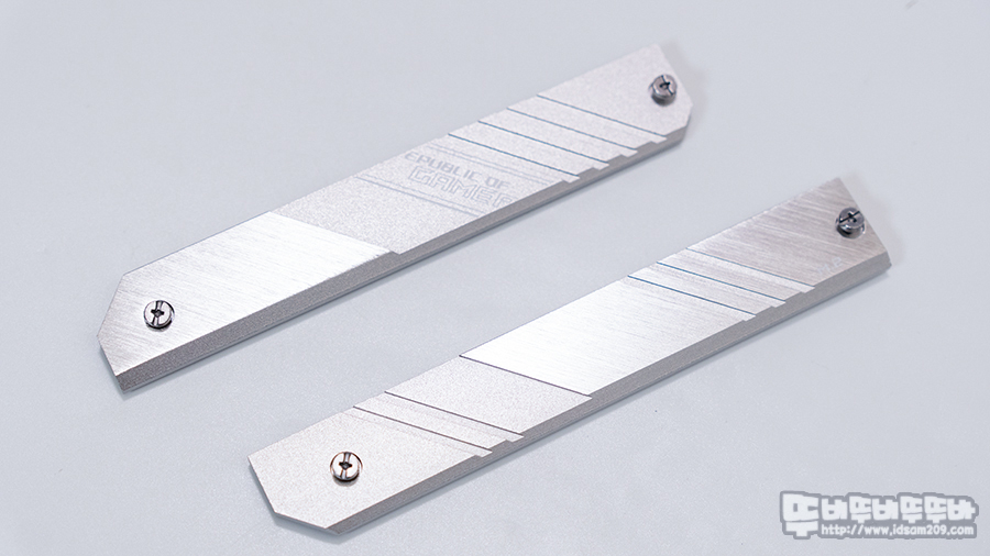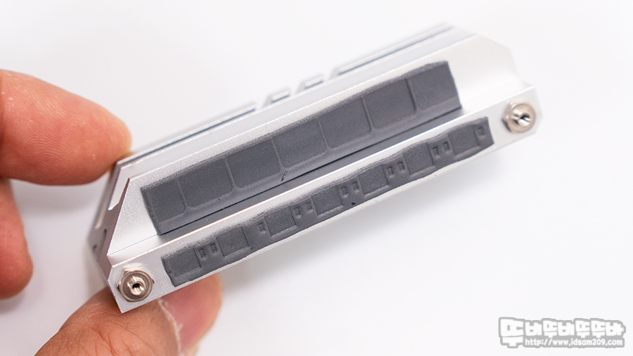 성능이 좋아 보이는 M.2 히트 싱크는 로고 각인으로 M.2 1, 2로 구분이 되며 안쪽의 써멀 패드는 접촉면의 보호 비닐을 제거하고 사용하시기 바랍니다.