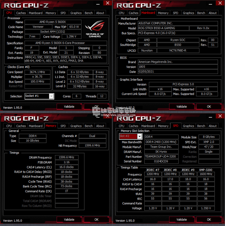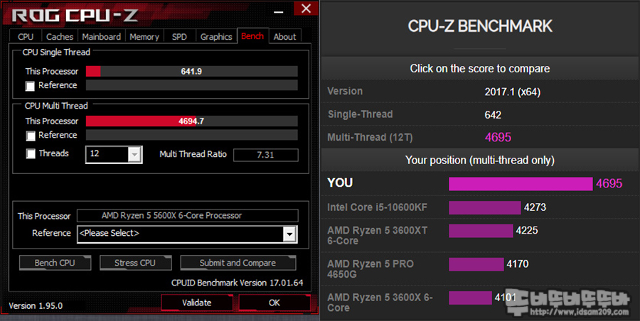 CPU-Z에서는 5600X의 기본 클릭인 3.7GHz과 TeamGroup T-Force DDR4-3200 CL16 XTREEM ARGB 메모리의 CL16-18-18-38 메모리 클럭과 벤치 테스트를 통해 싱글 쓰레드 642점, 멀티 쓰레드 4695점을 확인할 수 있었습니다.