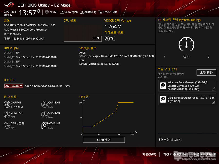 UEFI AMI BIOS의 첫 화면입니다. 이 화면에서 기본 CPU 정보에서 메모리 정보, 저장장치 정보, XMP 활성화, QFAN 제어까지 일목요연하게 확인이 가능하고요.