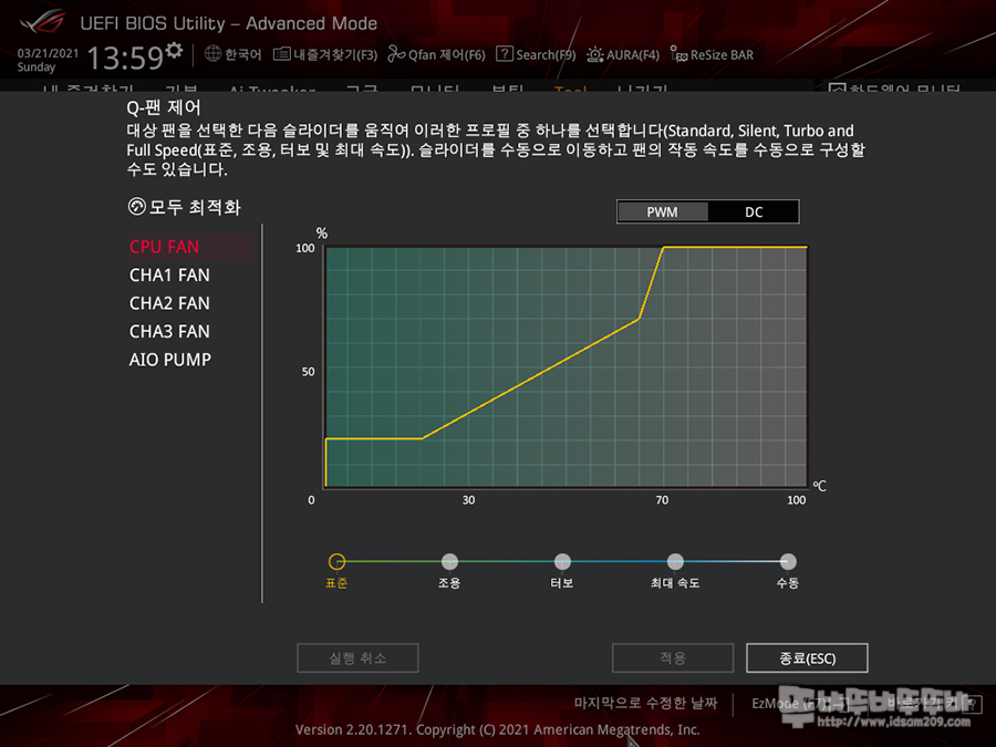 C-MOS에서 제어가 가능한 Q-FAN 제어화면의 경우 PWM 또는 DC로 선택이 가능하면 Fan Xpert 4가 설치되어있는 경우 윈도우 진입 후에는 Fan Xpert 4 소프트웨어의 설정에 따라 작동하게 되니 가급적 Fan Xpert 4를 사용을 권장합니다.