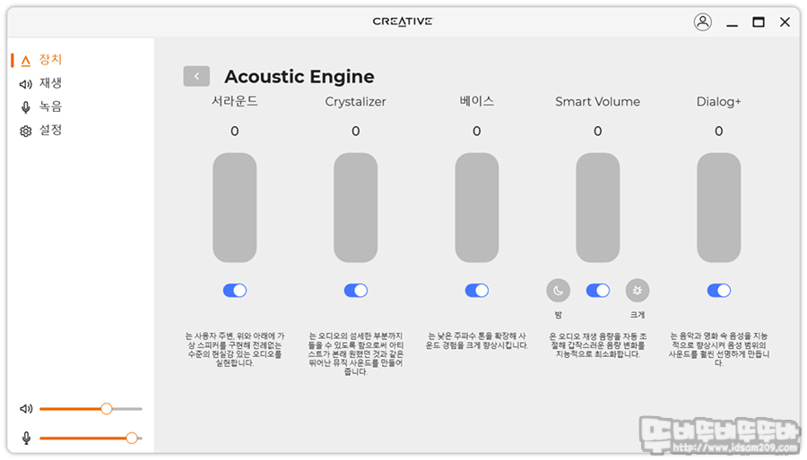 장치 메뉴는 Sound Blaster PLAY 4의 사운드 설정 기능이 모여있는데요.