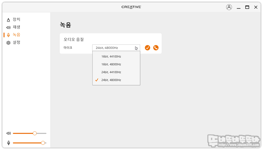 녹음 메뉴도 재생 메뉴와 비슷하게 마이크 음질에 대한 선택이 가능하며 최대 24비트/48kHz를 지원합니다.