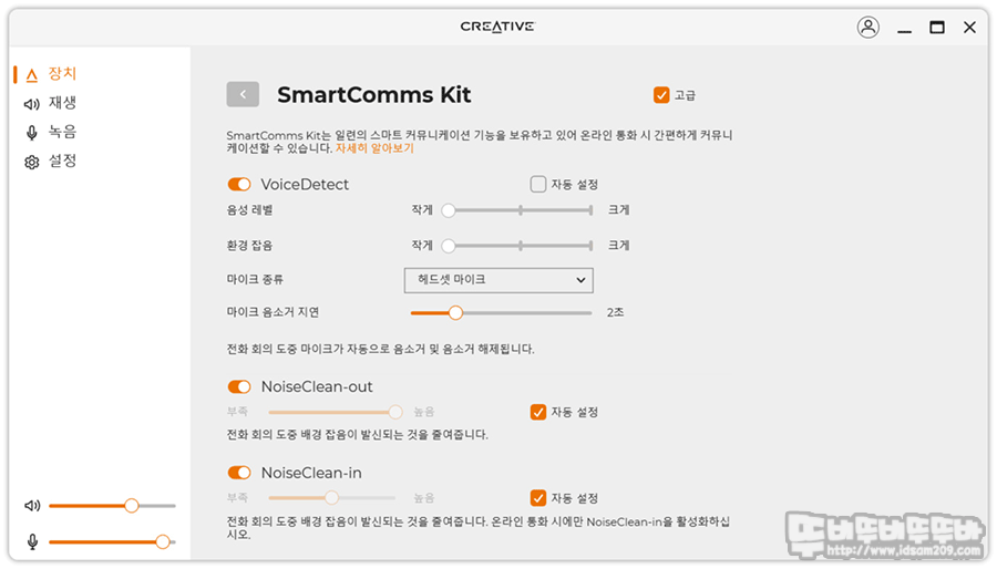 순서는 SmartComms Kit Off → SmartComms Kit On → SmartComms Kit 고급 (VoiceDetect) 설정으로 비교를 해보았습니다.