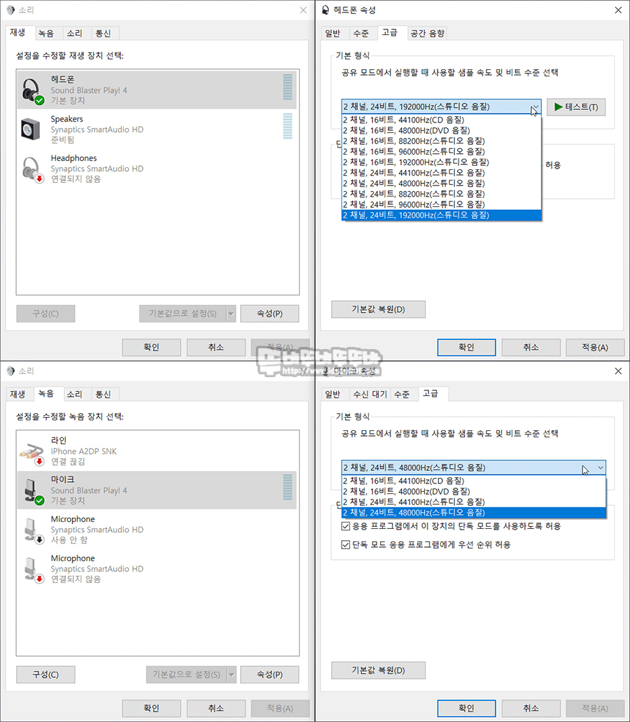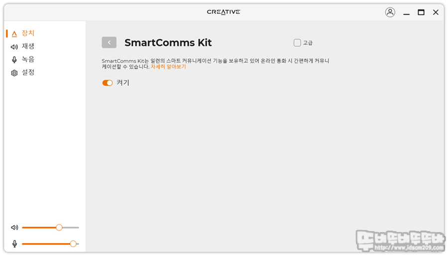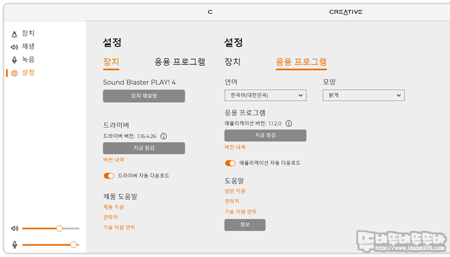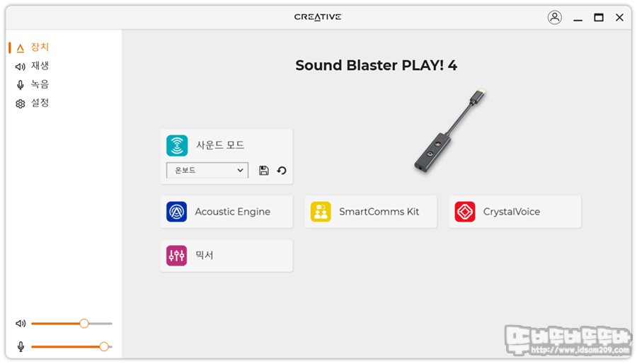 장치 메뉴는 Sound Blaster PLAY 4의 사운드 설정 기능이 모여있는데요.