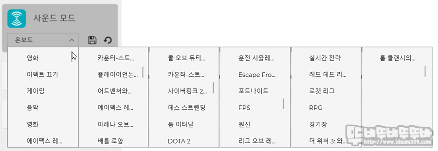 음악, 영화, 다양한 게임 등 최적화된 사운드 설정이 저장되어있는 사운드 모드는 취향에 따라 간단하게 선택하여 사용할 수 있게 디자인되었습니다.