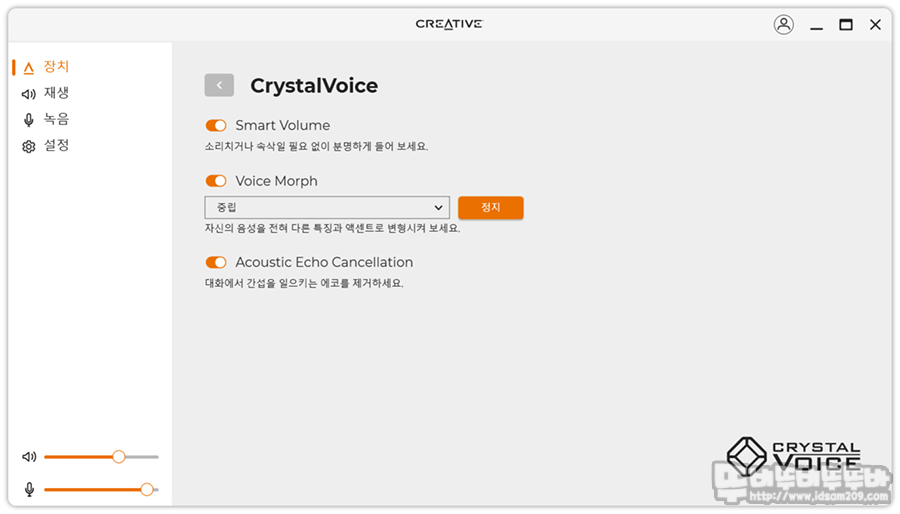 CrystalVoice에서는 Smart Volume, 음색을 변조는 Voice Morph, 에코 기능을 제거하는 Acoustic Echo Cancellation으로 구성되어있습니다.