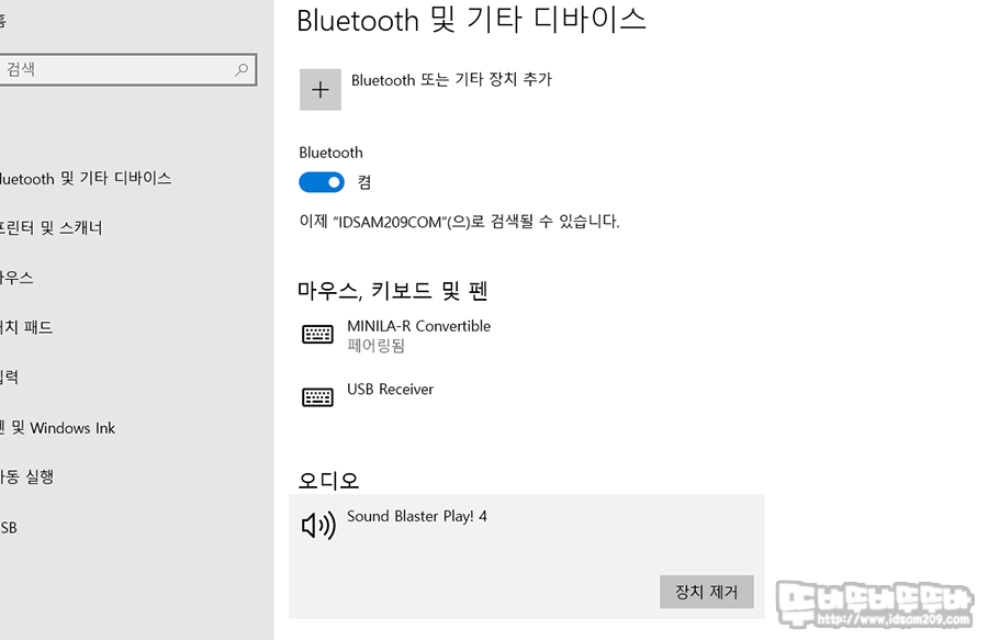 설정의 Bluetooth 및 기타 디바이스의 인식 모습.