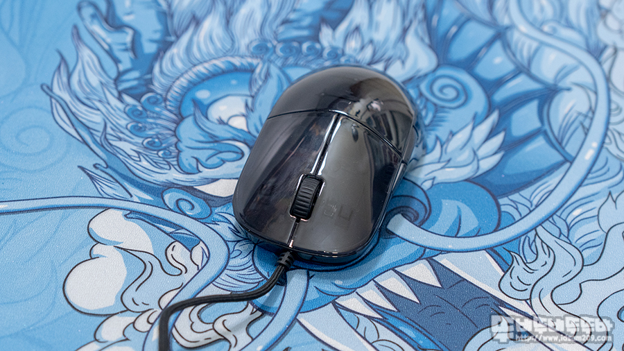 마우스 측면에 부착된 핫라인게임즈 로고 택 모습.