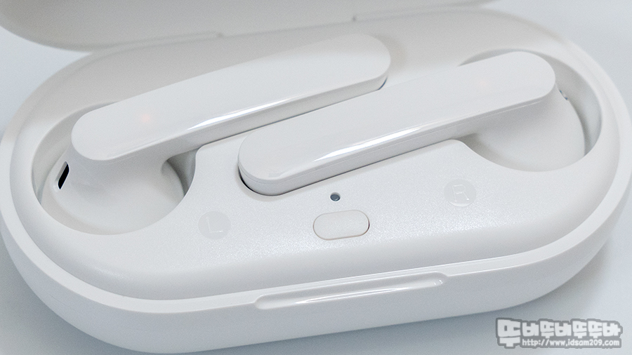 무선 이어버드가 대각선 형태로 수납하는 충전 케이스는 이어버드의 스틱 부분에 충전 단자와 연결되는 충전 핀이, 중앙부에 배터리 잔량을 확인할 수 있는 버튼과 LED 인디케이터 그리고 좌우를 구분하는 L, R 각인 표시로 편리하게 사용할 수 있게 디자인되었습니다.