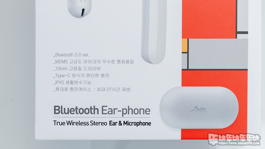 블루투스 버전 5.0, MEMS 고감도 마이크 사용, 10mm 드라이버 유닛, USB-C 충전단자, IPX5 생활 방수 지원, 충전 케이스 사용 시 최대 27시간 사용 등 패키지 정면에는 제품의 특징이 잘 표현되어있습니다.
