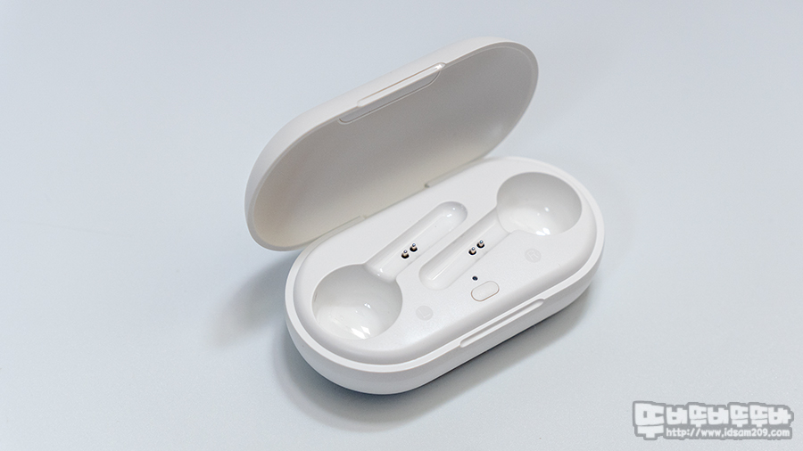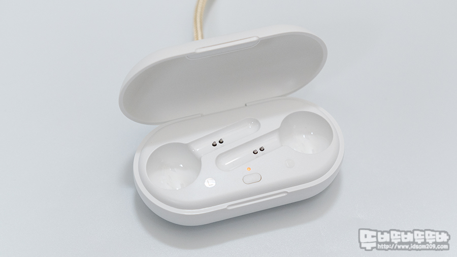 무선 이어버드가 대각선 형태로 수납하는 충전 케이스는 이어버드의 스틱 부분에 충전 단자와 연결되는 충전 핀이, 중앙부에 배터리 잔량을 확인할 수 있는 버튼과 LED 인디케이터 그리고 좌우를 구분하는 L, R 각인 표시로 편리하게 사용할 수 있게 디자인되었습니다.