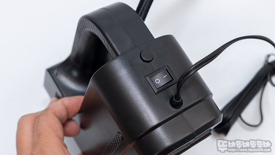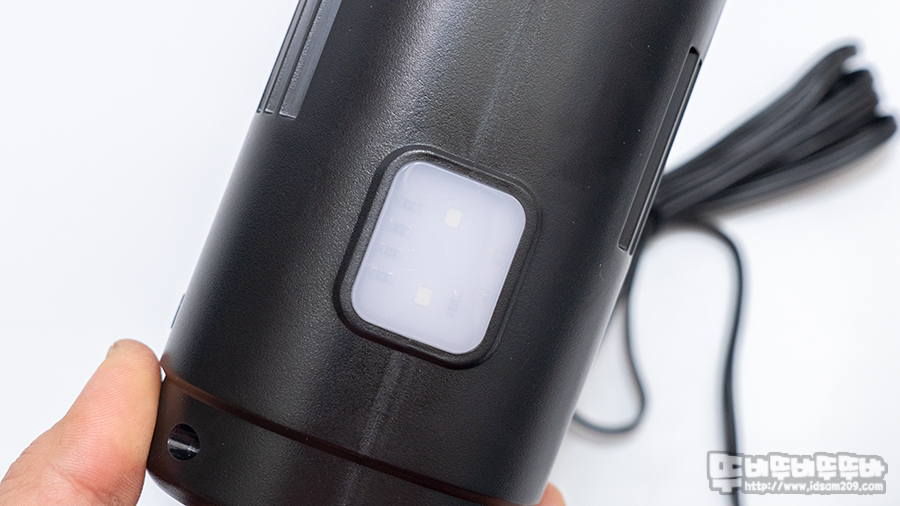 제품 전면은 야간에도 손쉽게 사용할 수 있게 LED가 내장되어있으며 뒷면에는 원형으로 디자인된 랜턴 On/Off 스위치와 압력 설정 후 컴프레셔를 작동하는 토클 방식의 스위치로 구성되어있습니다.