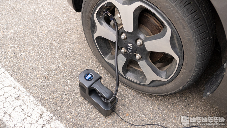 808 차량용 에어 컴프레셔 자동차 공기 주입기 무게가 가볍고 공기 주입 호수의 위치가 조금 애매한 곳에 있다 보니 공기 주입 시 중심을 잘 못 잡고 옆으로 기울어지는 단점이 있지만, 가격 대비 성능을 감안하면 타협할만합니다.
