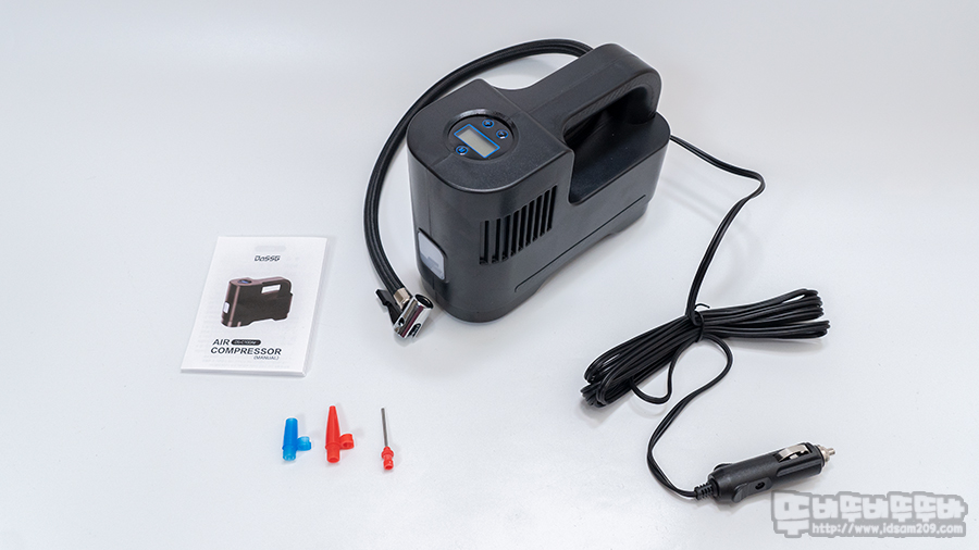 제품의 구성은 미니 컴프레서 본체, 사용 설명서, 3종 노즐 세트로 구성되어있습니다.