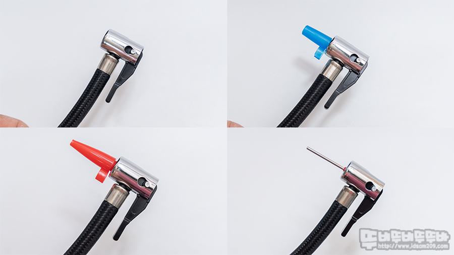 약 300cm 시가잭 전원은 대부분의 승용차에서 사용할 수 있는 넉넉한 길이를 제공하고 있으며 스냅식 고정 헤드로 디자인된 기본 차량용 노즐에 파란색과 빨간색의 튜브용 노즐, 공에 사용 가능한 니들을 연결하여 편리하게 사용할 수 있습니다.