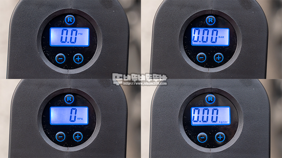 제품 상단부의 LCD 디스플레이의 R 버튼을 이용하여 PSI, KPA, BAR, kg/㎠ 압력 단위 선택과 +, - 버튼으로 공기압 수치 입력이 가능하고 야간에 작업 시 편리한 사용을 위해 LED 백라이트도 지원하고 있습니다.