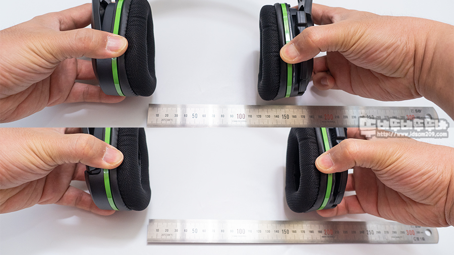 헤드셋 이어컵 부분을 11자 형태로 유지한 상태에서 늘려보면 헤어밴드의 길이 조절을 하지 않은 상태에선 약 120mm, 헤어밴드 길이를 최대로 했을 때 약 150mm 길이로 사용이 가능하며