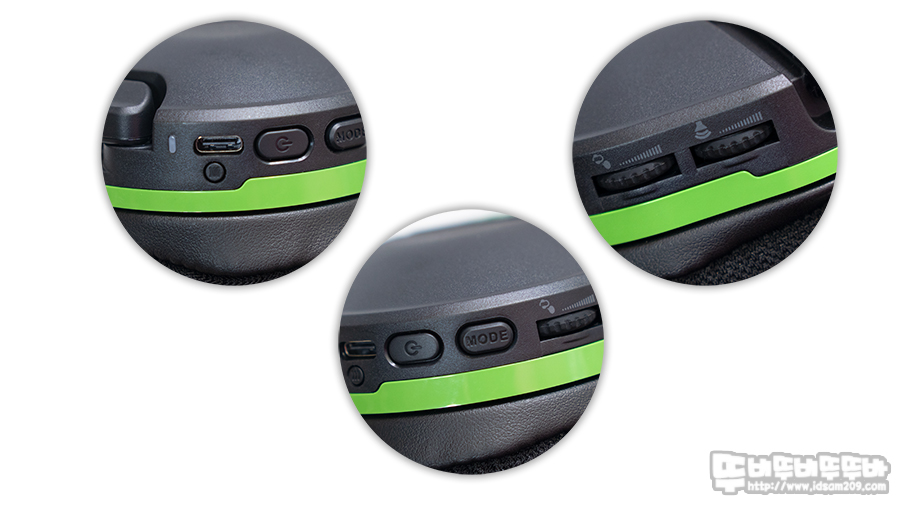 헤드셋 왼쪽 하우징에 몰려있는 컨트롤 버튼은 USB-C 충전단자와 페어링 버튼, 배터리 상태와 제품 상태를 알려주는 LED 인디케이터, 전원 스위치와 Mode 버튼 그리고 Chat 믹서 볼륨 다이얼과 볼륨 다이얼로 구성되어있습니다.