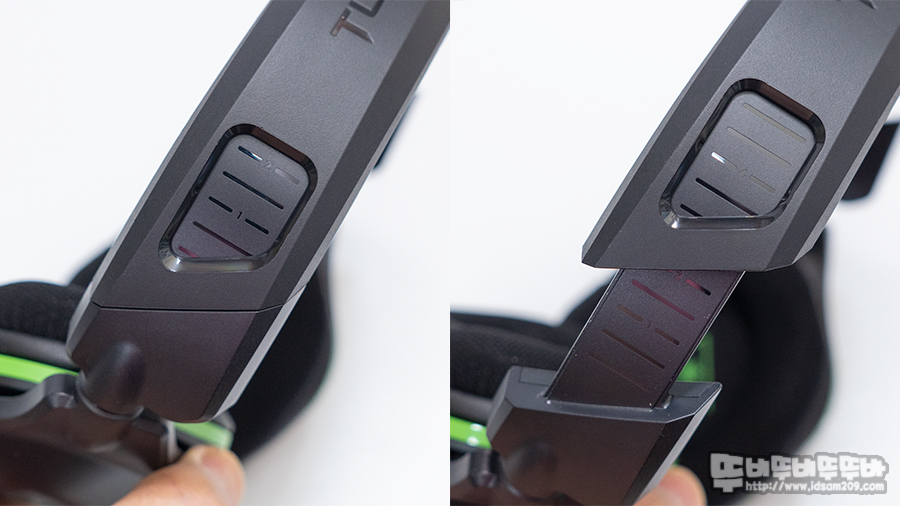 헤어밴드 상단에 터틀비치 로고 각인 모습.