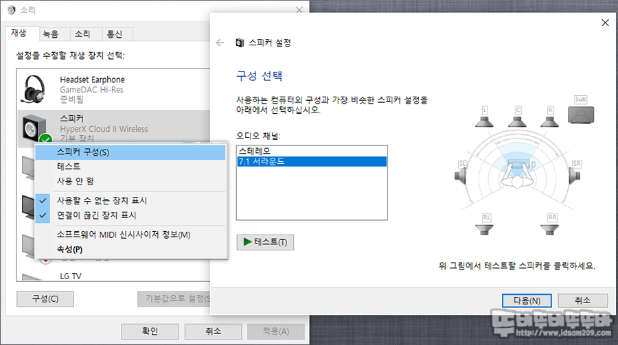 특히 전용 소프트웨어를 설치하는 않은 상태에서 소리 설정에 스피커 설정을 7.1 채널 사운드로 선택하여 사용이 가능하지만 가급적 소프트웨어 설치를 권장합니다.