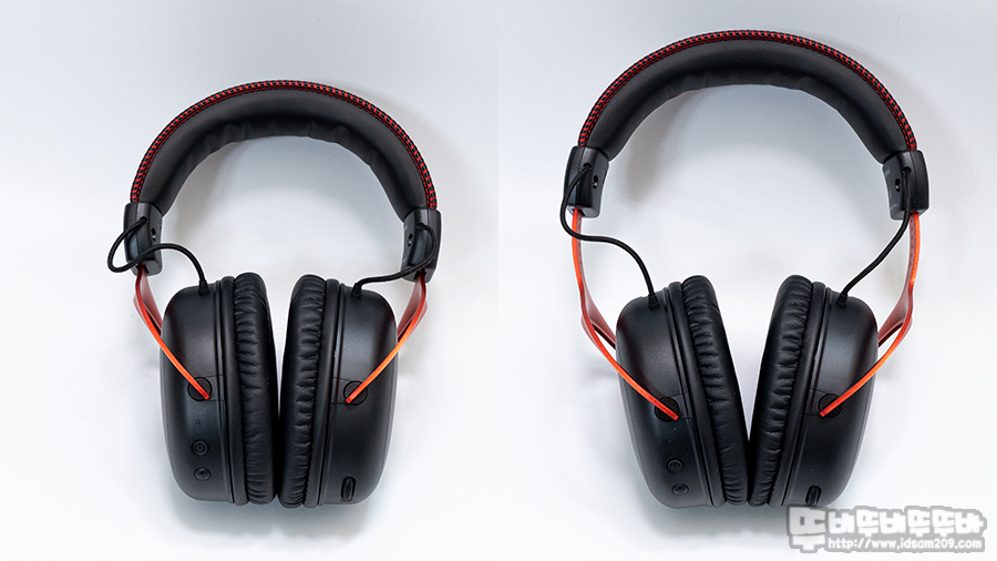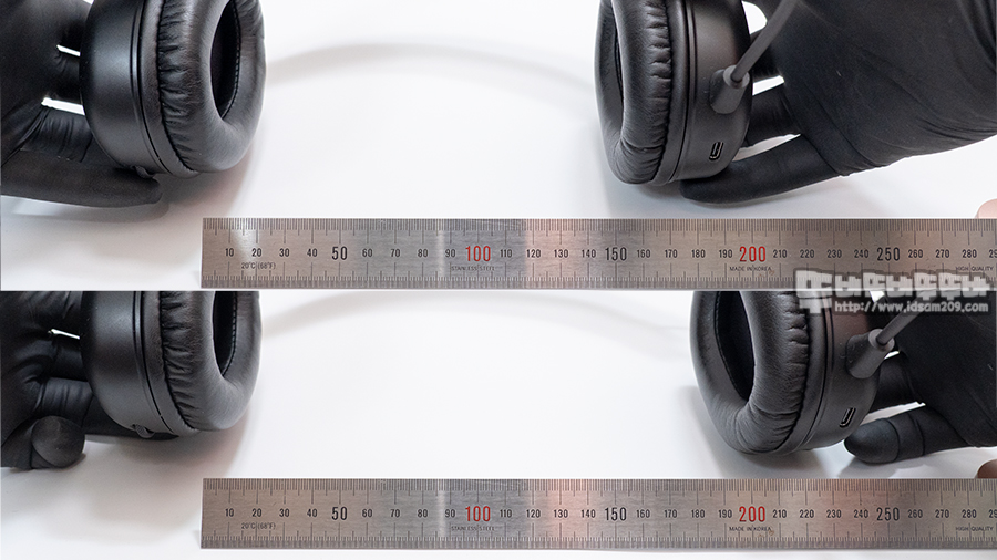 이어패드가 11자 형태로 유지되는 상태를 확인해보면 최소 높이 조절에서는 약 150mm, 최대 높이 조절에서는 약 200mm로 보통의 헤드셋보다 더 편안하게 착용이 가능하며 이어패드가 누르는 장력이 덜한 편입니다.