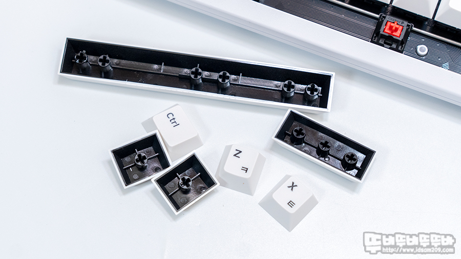 간결하게 각인된 블랙 컬러의 이색 사출 각인은 화이트 베이스에 잘 어울리는 느낌이며 우리가 흔히 알고 있는 PBT의 까실한 표면 느낌이 아닌 ABS와 같은 매끈한 표면 느낌을 주기에 이게 PBT야? ABS야? 하는 헷갈림을 주기도 합니다.