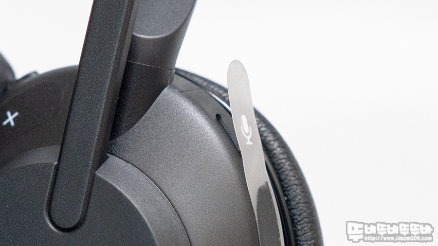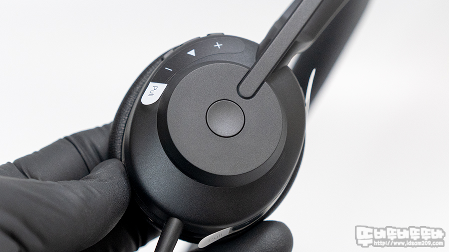 헤드셋 앞쪽에 마이크 On/Off 버튼 뒤쪽에 볼륨 및 트랙 컨트롤, 중앙에 미디어 재생/멈춤 기능을 지원합니다.