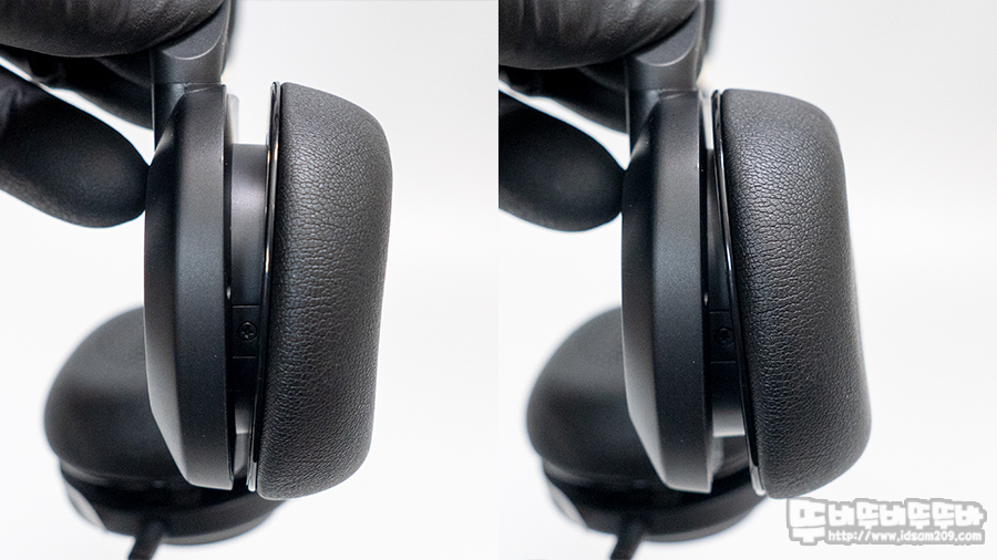 헤드셋의 스피커 유닛 부분은 약간의 틸트를 지원하여 편안한 착용감을 지원하며 독특하게도 이어패드 안쪽에 타공 모양으로 왼쪽(L), 오른쪽(R)을 구분하고 있습니다.